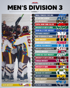 The Top 16 teams will be invited to the Men’s Division 3 Nationals in St Louis, MO, on March 18-22. The next ranking is scheduled to be released on November 14th.